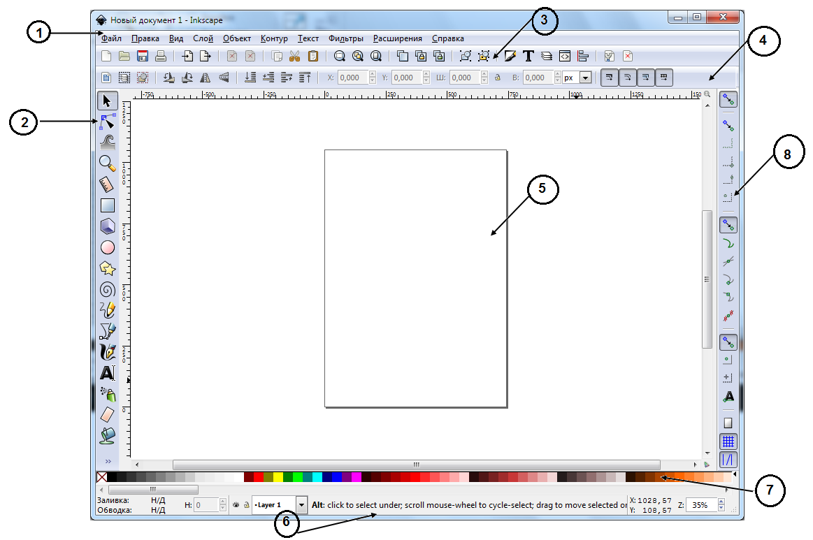 На рисунке показано окно программы InkScape. Здесь несравнимо больше возможностей, чем предоставляет стандартный графический редактор Paint. В то же время интерфейс InkScape логичен и достаточно прост.