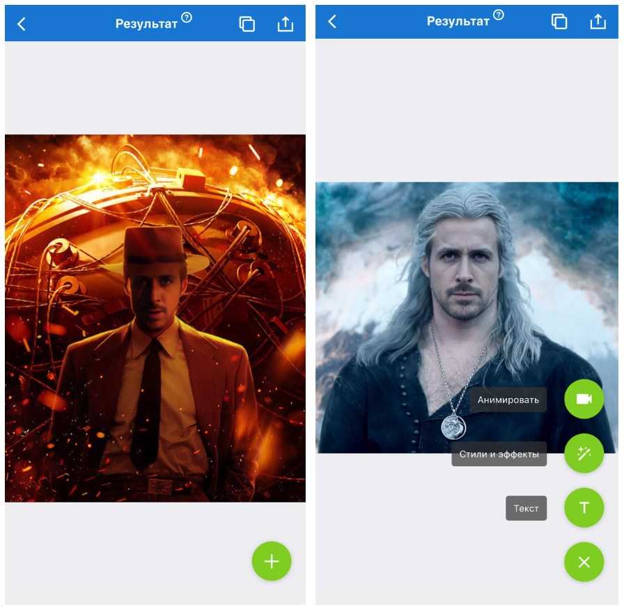 С помощью технологий искусственного интеллекта в приложении можно изменить лица на фотографиях. Например, сделать из Райана Гослинга Роберта Оппенгеймера или Геральта из Ривии