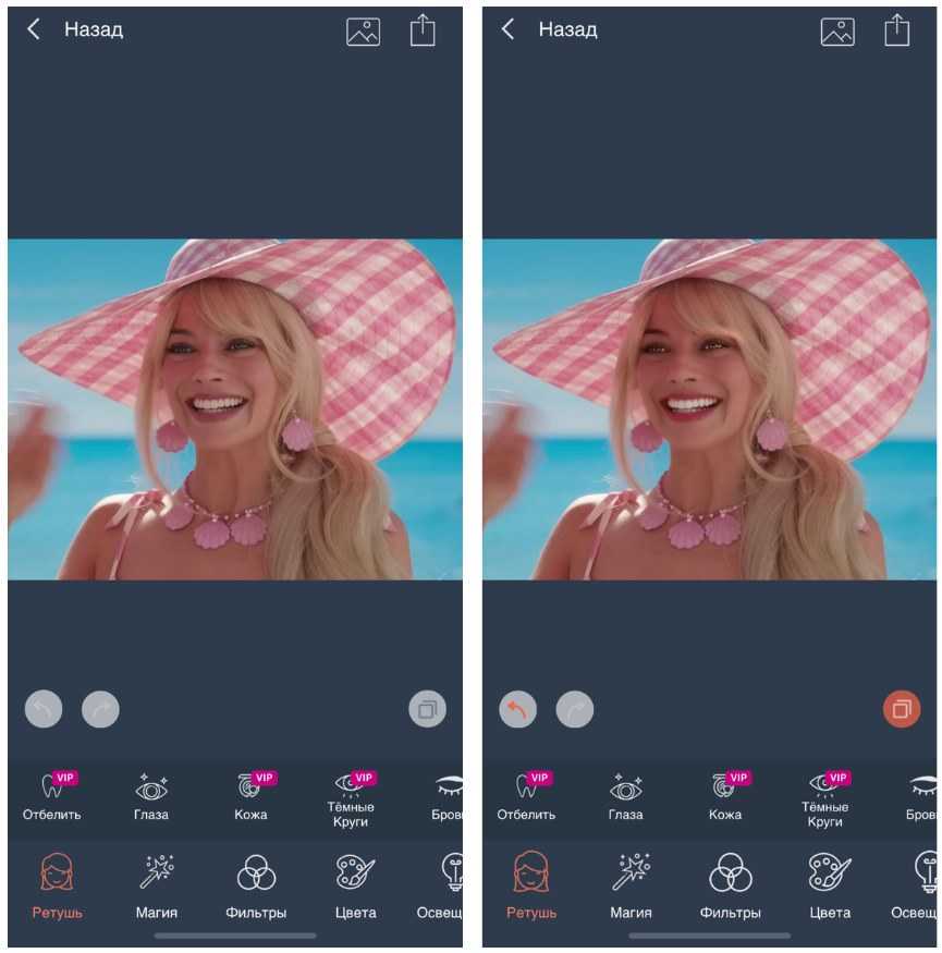 Кадр из «Барби» до и после обработки в PhotoDiva. Без подписки можно воспользоваться лишь несколькими инструментами — добавить блеск глазам, затемнить брови, улучшить вид кожи, поменять настройки яркости и контрастности