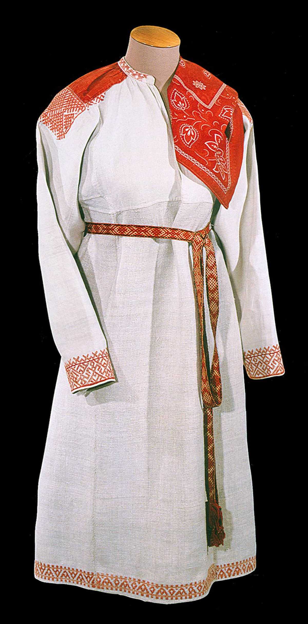 Главный элемент русского костюма. Составная или цельнокроеная, из хлопка, льна, шелка, кисеи или простая холщовая, рубаха непременно доходила до щиколоток. Подол, рукава и ворот рубах, а иногда и нагрудная часть украшались вышивкой, тесьмой, узорами. Причем цвета и орнаменты различались в зависимости от области и губернии. Воронежские женщины предпочитали вышивку черного цвета, строгую и изысканную. В Тульской и Курской областях рубахи, как правило, плотно вышиты красными нитями. В северных и центральных губерниях преобладали красный, синий и черный, иногда золотой.