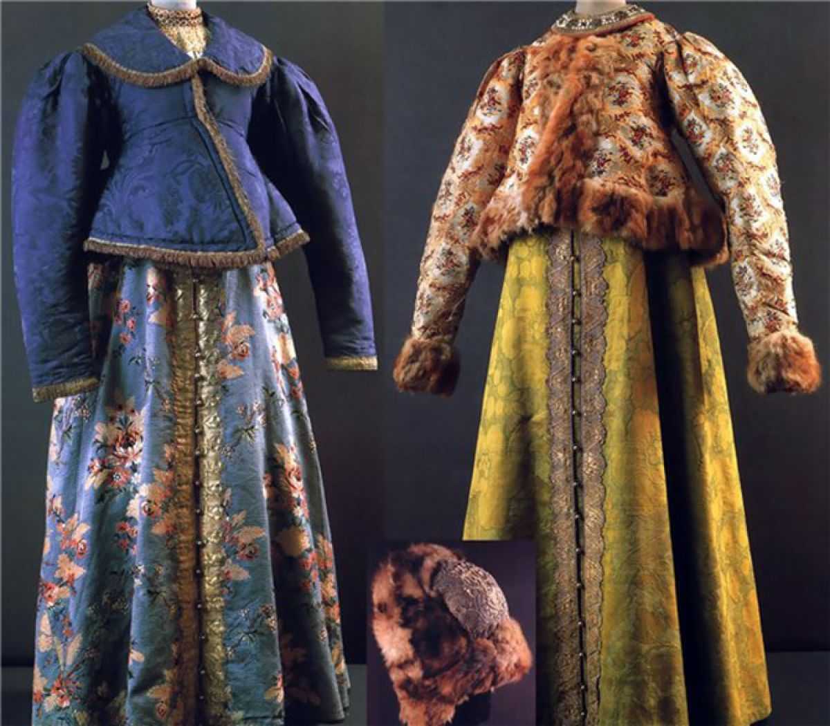 Вторая половина 18 века. Екатерина II попыталась вернуть в костюмы дворянства европейского стиля русскую самобытность. Это проявилось в тканях и пышности оформления нарядов.