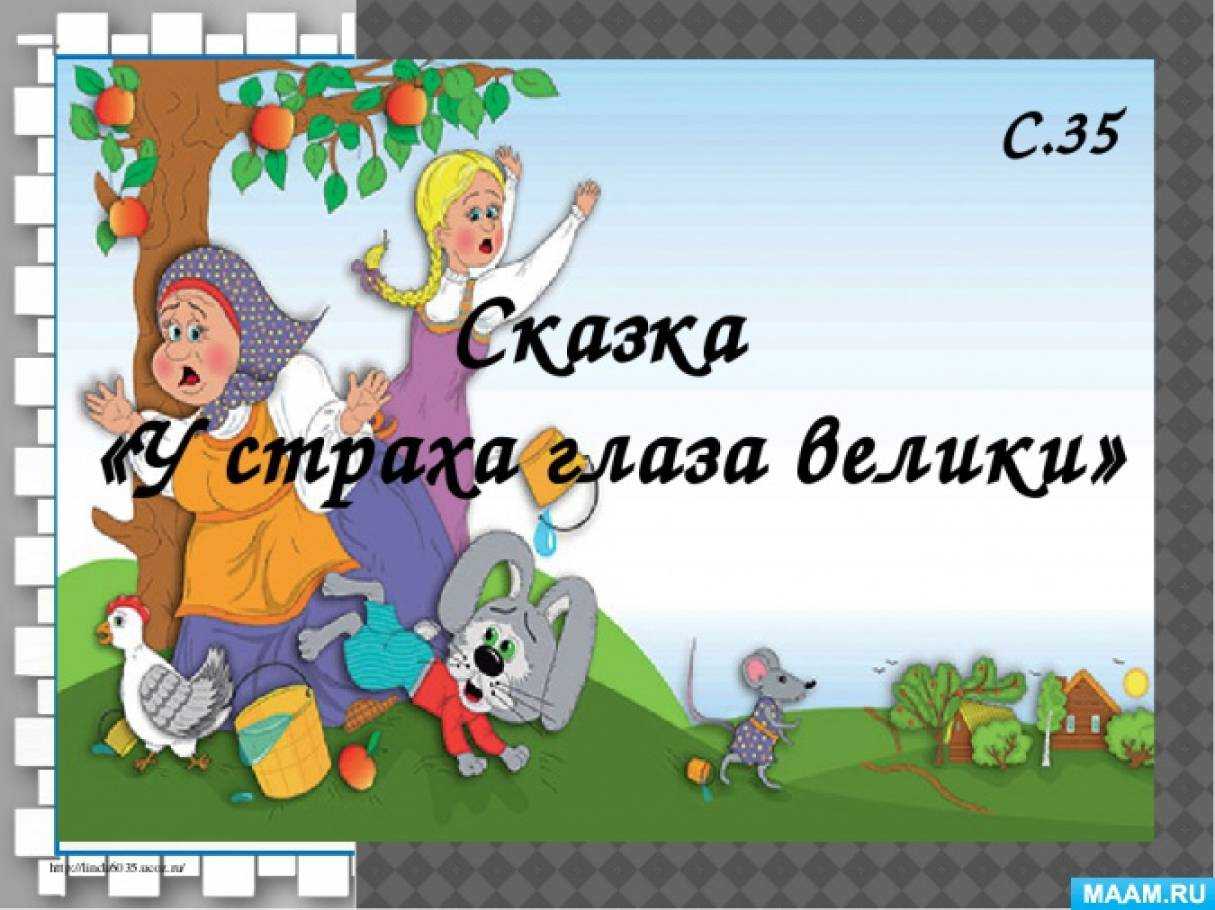 Чтение русской народной сказки «У страха глаза велики» Конспект открытого занятия по развитию речи во второй младшей группе Тема: «Чтение русской народной сказки «У страха глаза велики». Образовательная.