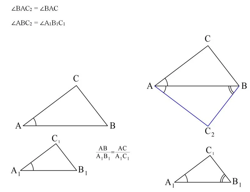 Необходимо доказать, что они подобны. Для этого построим ещё один ∆AВС2, который будет иметь общую сторону с ∆AВС, причем точку С2 мы выберем так, что будут выполняться условия:
