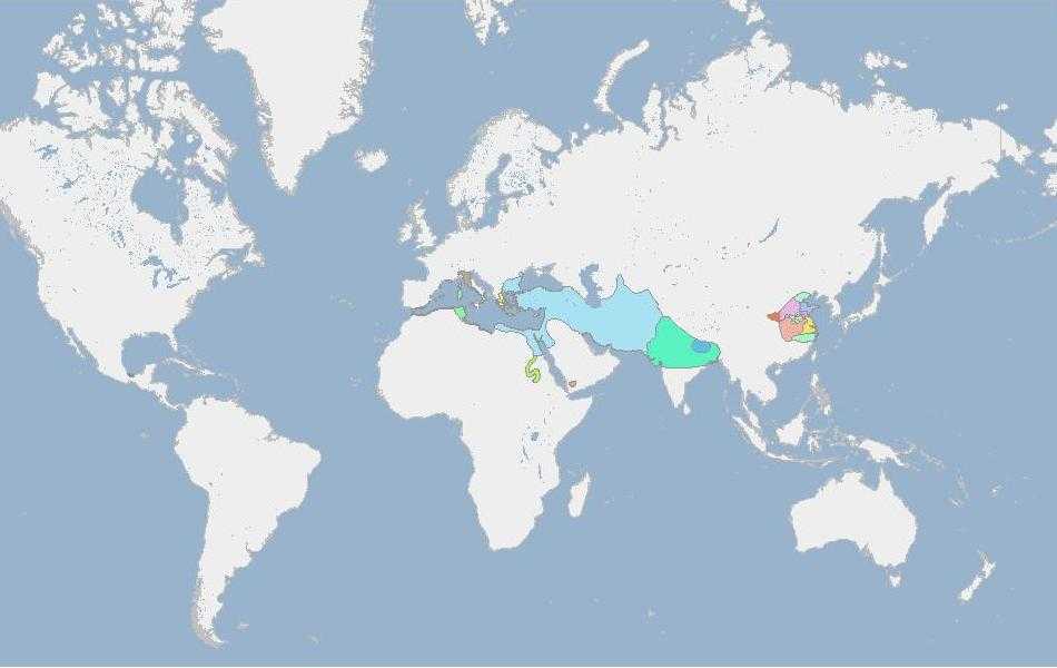империи, голубой цвет — Парфянская империя, Китайская Империя династии Хань.