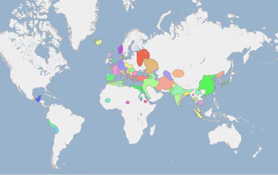 Болгария(красная) на западе Средиземного моря. В Южной Америке — район Перу и