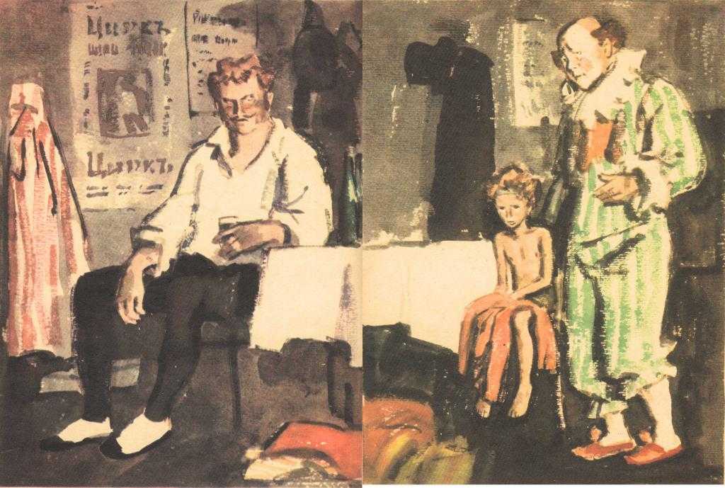 Клоун хотел взять гуттаперчевого мальчика, которому было лет восемь, с собой на прогулку, но Беккер – его наставник и учитель, не отпустил его. Мальчик очень огорчился этому.