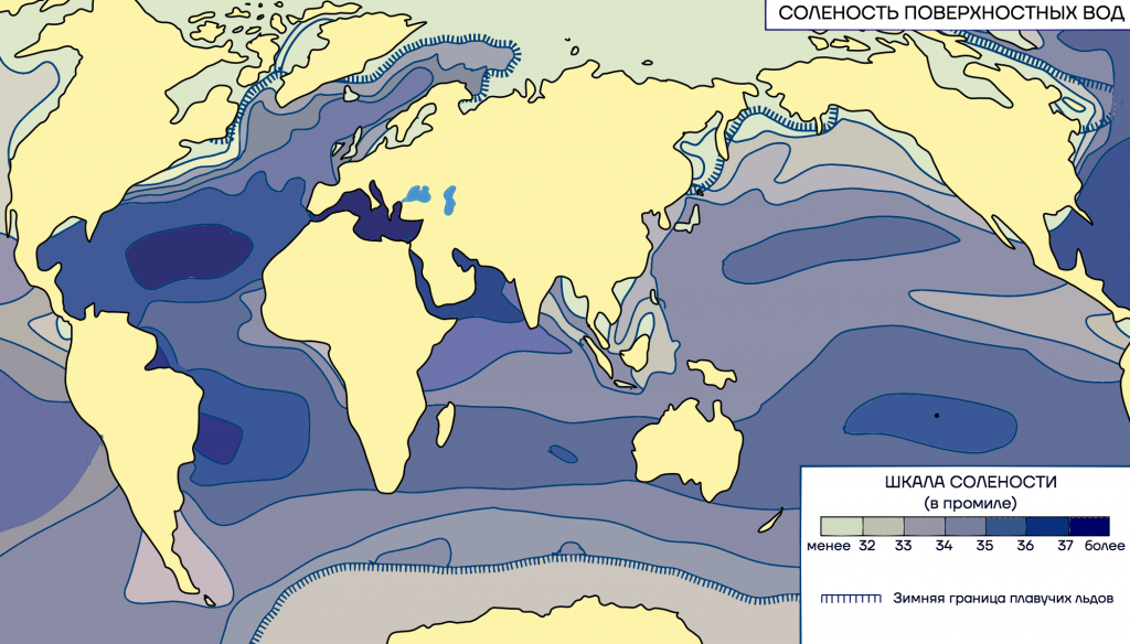 Солёность — одна из самых главных характеристик водных масс. Средняя солёность океана 35‰. Что это значит? Что в одном литре воды растворено около 35 грамм соли. Самый пресный океан — Северный Ледовитый, самый соленый — Атлантический.
