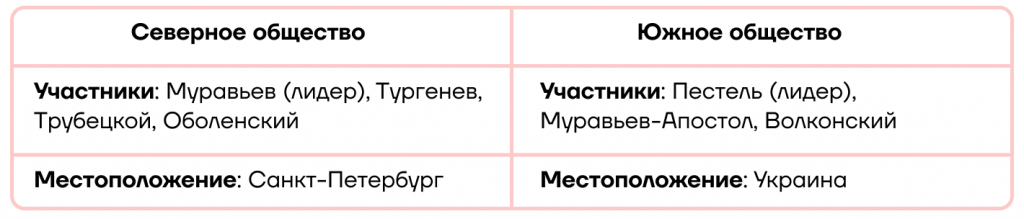 - Северное в Петербурге (1822-1825). Руководитель: Н.М. Муравьев. Программа — «Конституция»: конституционная монархия, федеративное государство, крестьянам — свобода и две десятины земли.;