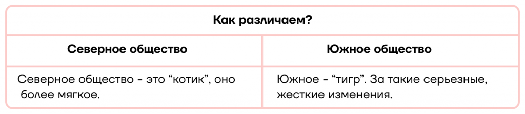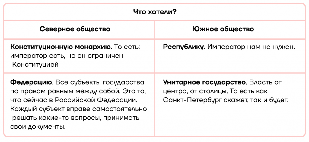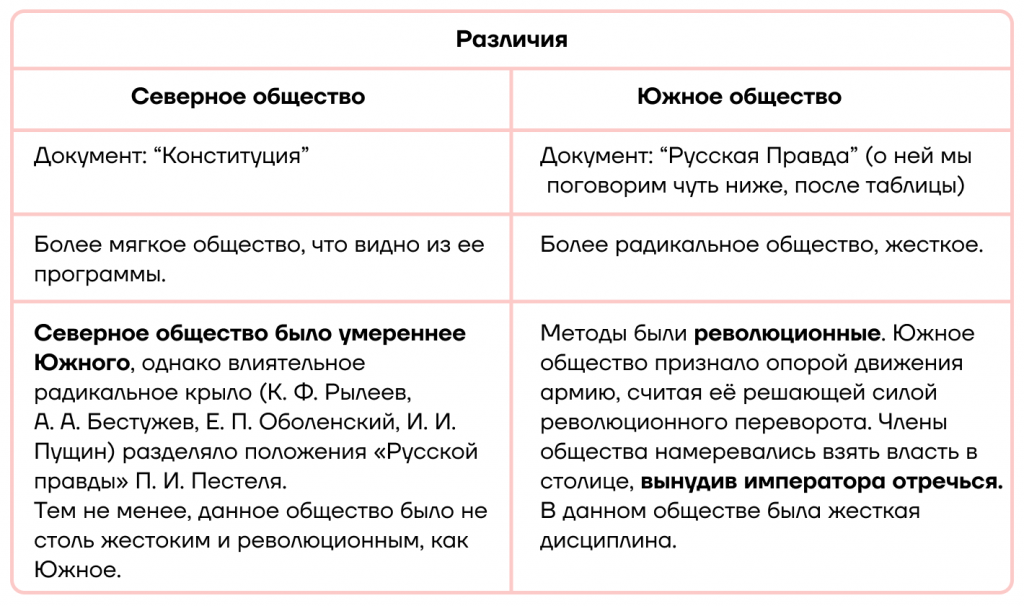 Различия: Северное общество выступало за установление конституционной монархии, ограничение избирательных прав имущественным цензом, крестьян предполагалось освободить почти без земли. Южное общество выступало за установление республики, равенство избирательных прав, крестьяне должны освобождаться с землей.