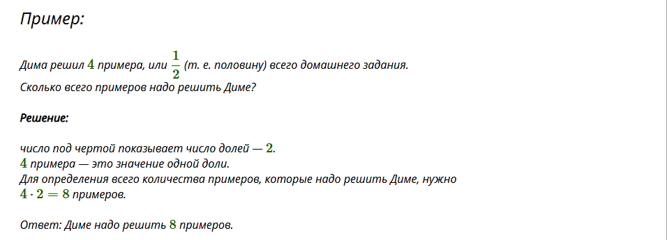 Если обобщить и упростить все выше сказанное в теории, то чтобы найти число по его доле, нужно умножить данное целое число в задаче на знаменатель ( количество долей).