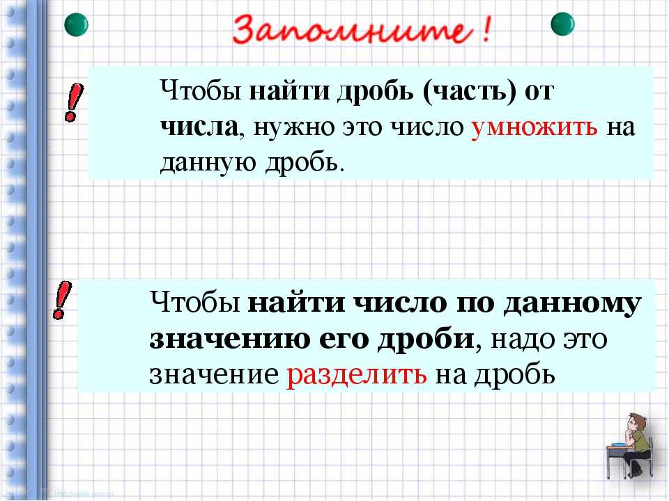 Есть задачи на нахождение доли числа или наоборот, числа по его доле. Разберем подробно каждый вид задач. Научимся сначала находить долю числа. Для этого данное вам целое число делим на знаменатель и результат умножаем на числитель.