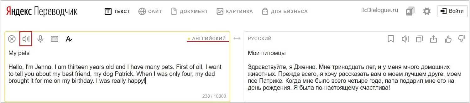 Рис. 2 (Кликните для увеличения). Яндекс переводчик для перевода и прослушивания текста.