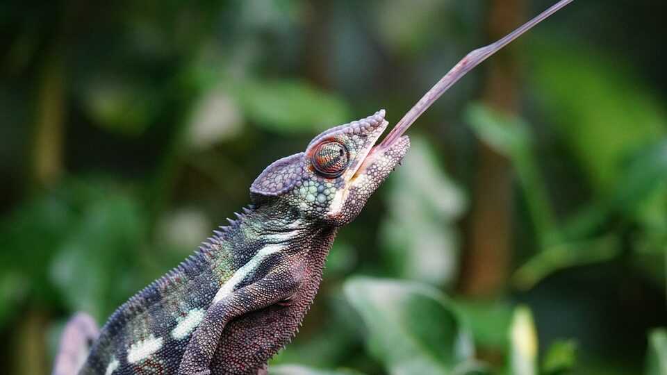Хамелеон выбрасывает язык, чтобы схватить им добычу