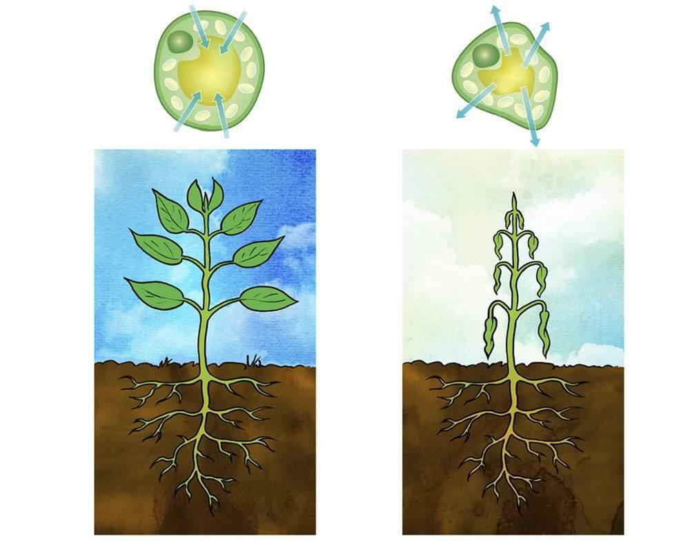 На изображении представлены растения и их клетки с достаточным количеством воды (слева) и ее нехваткой (справа).