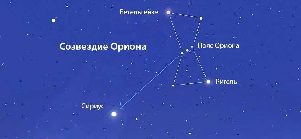 Слева и справа от этой тройки находятся две яркие звезды. Ближайшая к созвездию Близнецов и имеющая красноватый оттенок – это Бетельгейзе, а звезда, которая правее и немного ниже трех звезд, – Ригель. Все эти звезды образуют созвездие Ориона, а три звезды являются его “поясом”. Кстати, верхняя звезда пояса Ориона расположена почти на небесном экваторе, поэтому звезды ниже нее принадлежат к южному полушарию неба, а те, что выше, – к северному полушарию.