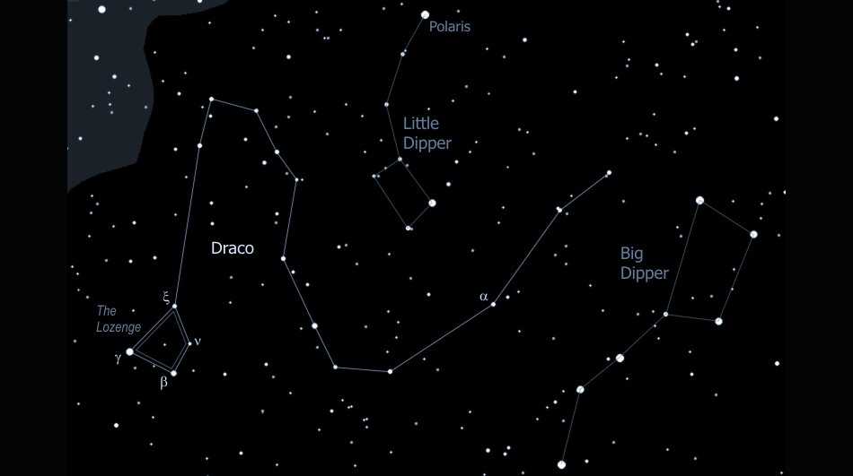 Созвездие Дракона находится между Большой и Малой Медведицами. Чтобы его найти, просто определите местоположение двух “ковшей”.