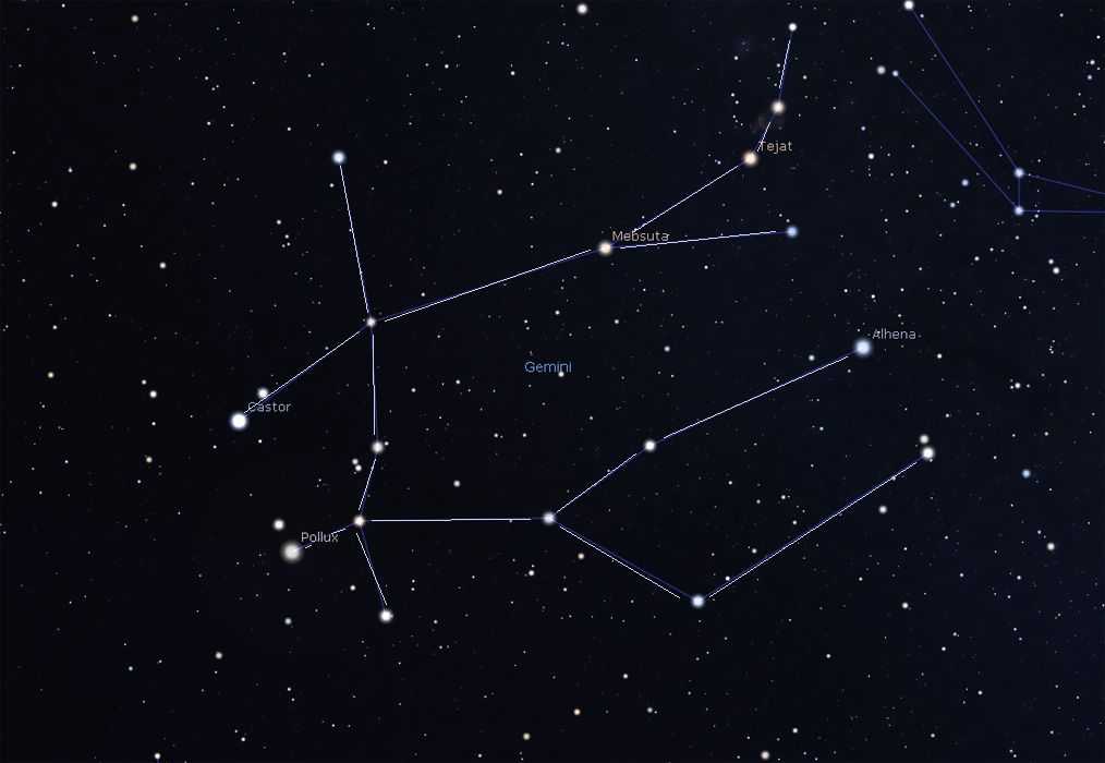 Используя всем известный ковш Большой Медведицы как отправную точку, проведите мысленную прямую линию, начиная от самой слабой звезды ковша (Мегрец) и проходя через крайнюю правую звезду ковша (Мерак) в направлении востока. По этой линии вы обнаружите две яркие звезды, расположенные одна над другой под почти прямым углом к горизонту. Эти звезды являются главными звездами созвездия Близнецов. Звезда, которая находится выше, называется Кастор, а звезда, расположенная ниже, – Поллукс. Поллукс ярче Кастора.